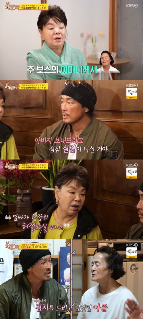 김수미는 추성훈과 먼저 만나 어머니의 음식 취향을 물어봤다. 그러면서 남편과 사별한 어머니를 걱정하며 "엄마가 굉장히 허전하실 때다. 아버지 보내드리고 이제 점점 실감이 나실 것"이라고 말했다.