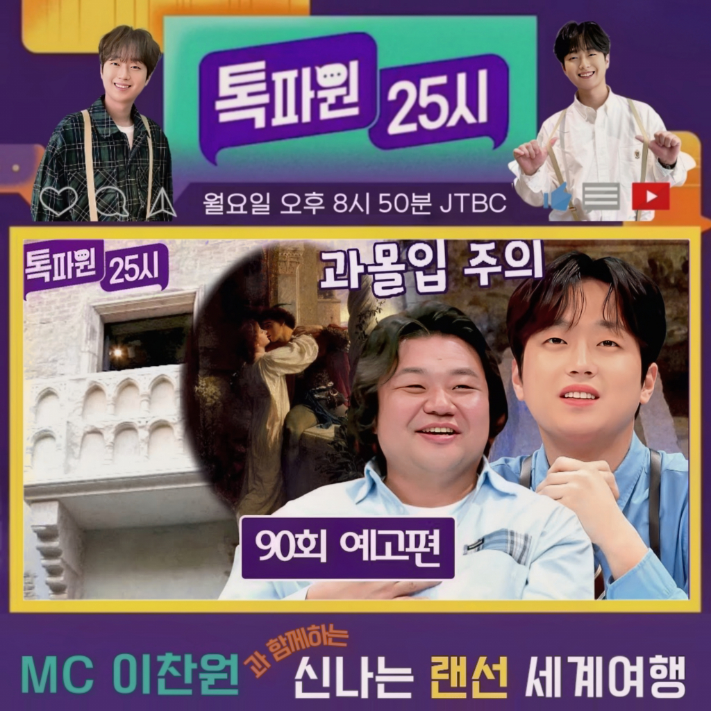 마지막으로는 소설 '로미오외 줄리엣'의 배경 도시 이탈리아 베로나. 소설 속 테라스 영상이 눈앞에 보이자 이를 본 이찬원은 두 손을 살며시 모으고 "저기 가면 없는 사랑도 생기겠다 진짜~"라며 사랑스러운 눈빛으로 바라봐 시청자를 감성에 젖게 했다.