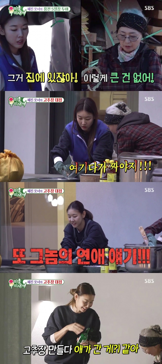 마지막으로 고추장에 소주를 넣으라는 어머니의 말에 소주를 들고 오던 한혜진은 "추운데 조금만 먹어도 될까"라며 소주를 마셨고, 어머니는 "고추장 만들다 애가 (맛이) 간 거 같다"라고 독설을 날렸다.