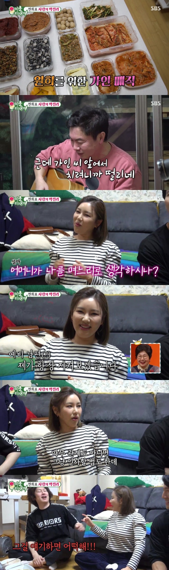그런가 하면 임원희의 집에 김종국, 김희철 그리고 '트롯 여제' 송가인이 방문했다. 일주일 전 만든 '짠희표 사랑의 막걸리'를 오픈하는 날에 맞춰 방문한 세 사람. 송가인은 집에서 직점 담근 파김치와 고추장, 된장 등 '13첩 집 반찬'을 싸와 집주인 임원희를 감동시켰다. 송가인은 시큼하게 발효된 짠희표 막걸리에 벌꿀을 넣어 심폐 소생을 시도했고, 직접 한상을 차려내 모두를 감탄하게 했다.
