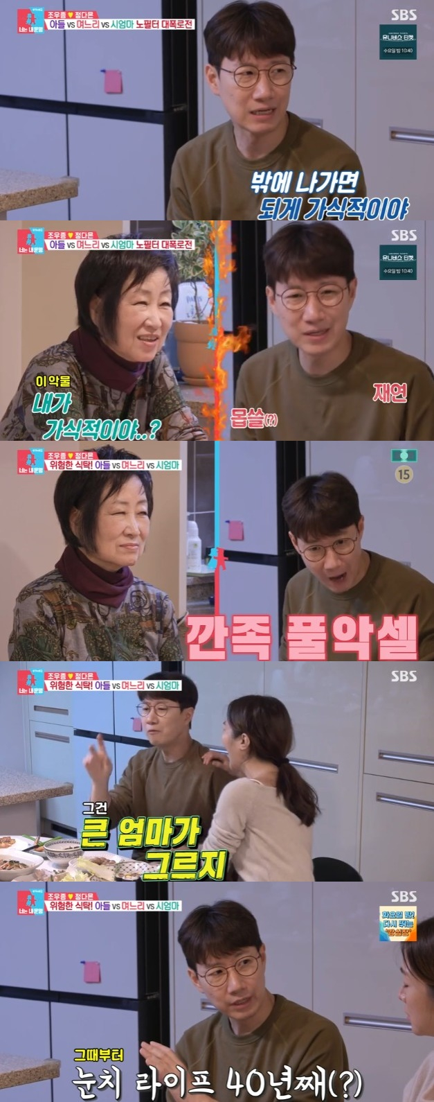 이어 조우종은 따가운 눈총을 보내는 어머니의 시선을 아랑곳하지 않고 "사실 집에선 '야, 우종이 이새X야. 혼날래'라고 하시면서 전화가 오면 돌변한다"며 그를 흉내냈다. 그러자 조우종의 어머니는 "내가 그랬다고? 그건 큰 엄마가 그러지. 나는 욕을 하거나 그런 적 없어"라며 욕받이 대상을 변경해 웃음을 안겼다.