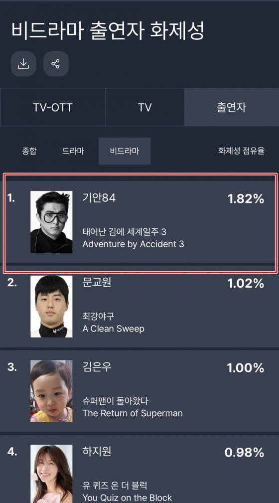 이어 비드라마 출연자 화제성에서는 기안84가 2주 연속 1위에 올랐다. 이외에도 뉴스기사 수 3위, VON 게시글 수 1위, VON 댓글 수 4위와 비드라마+OTT 순위 3위를 기록하는 등 시청자들의 뜨거운 사랑을 받고 있다.