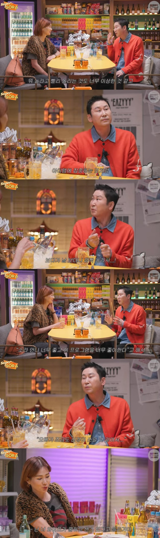 신동엽은 "(아내가) '(이) 소라 언니가 너무 좋고 프로그램도 좋은데 계속 보면 오빠가 조금 신경이 쓰일 거 같았다'고 하더라. 그래서 그날 우리 둘 다 편하게 보자고 합의했다"고 했다.