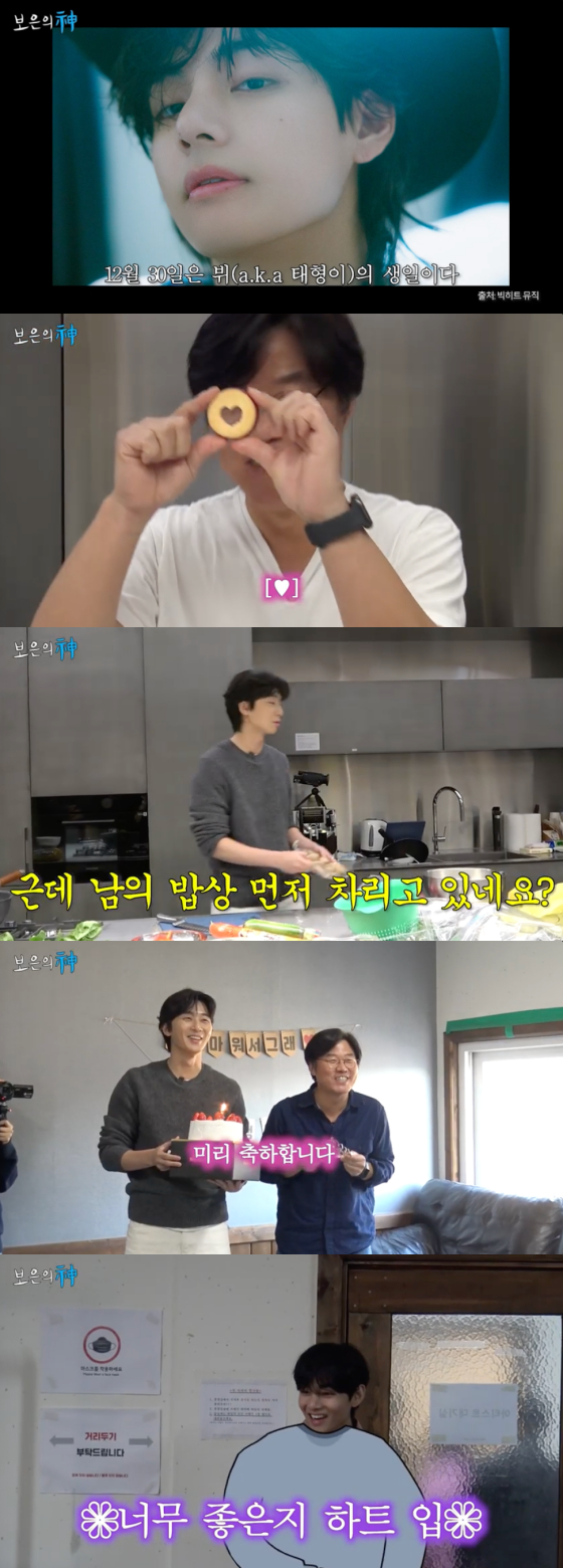 나영석은 박서준과 함께 뷔가 제일 좋아하는 김자반, 갈비찜, 미역국, 케이크 등을 만들었다. 박서준은 자신의 생일도 같은 달 16일이라며 "근데 남의 밥상 먼저 차리고 있다"고 투덜대 웃음을 안겼다.
