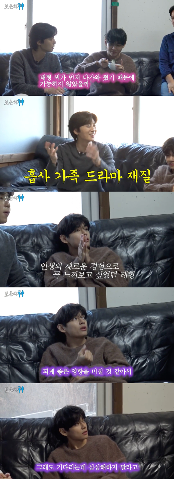 뷔는 이어 아버지가 어린 시절 군대 에피소드를 재밌게 전해주셨다고 그 이유를 밝혔다. 나영석 PD는 이에 "쉽지 않은데 긍정적이다"며 감탄했다. 뷔는 자신을 기다려주는 팬들을 위해 바쁜 일정 속에서도 개인 콘텐츠를 찍고 있다 밝혀 훈훈함을 더했다.