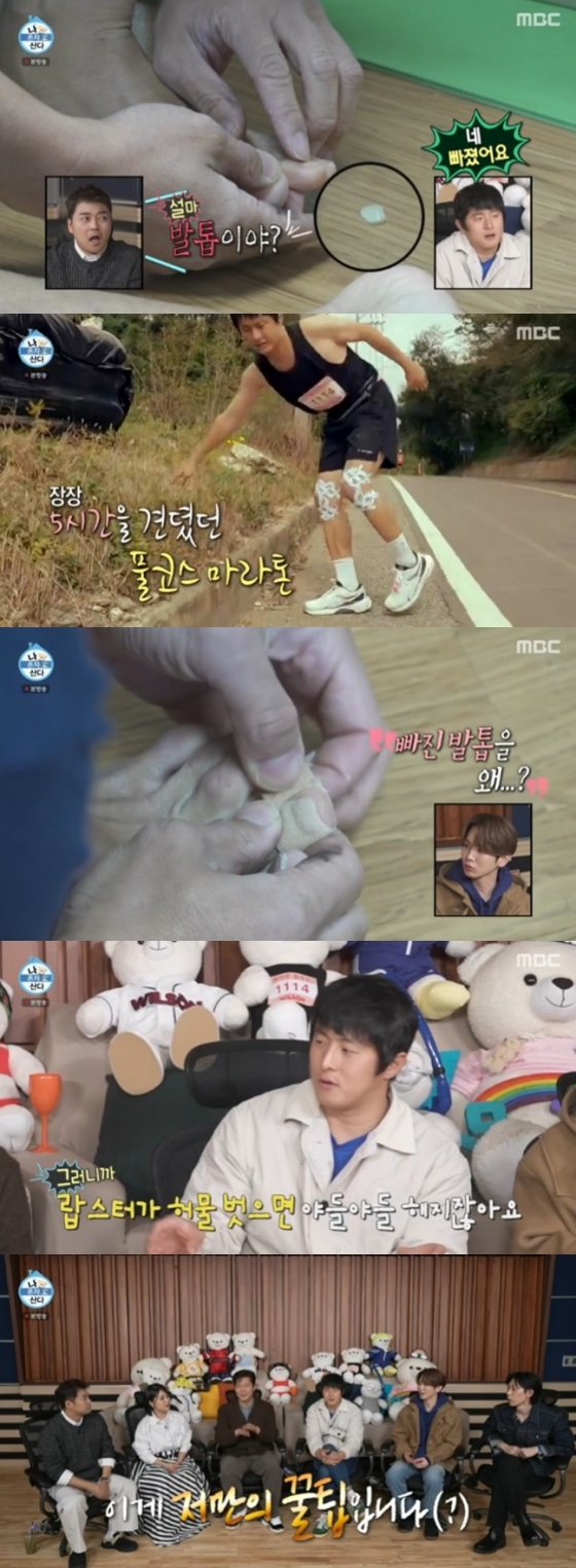방송인 겸 웹툰작가 기안84가 마라톤 후 빠진 발톱을 그대로 발가락 위에 놓고 다시 테이핑해 충격을 안겼다.