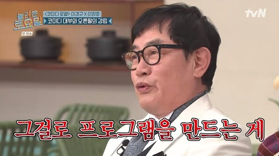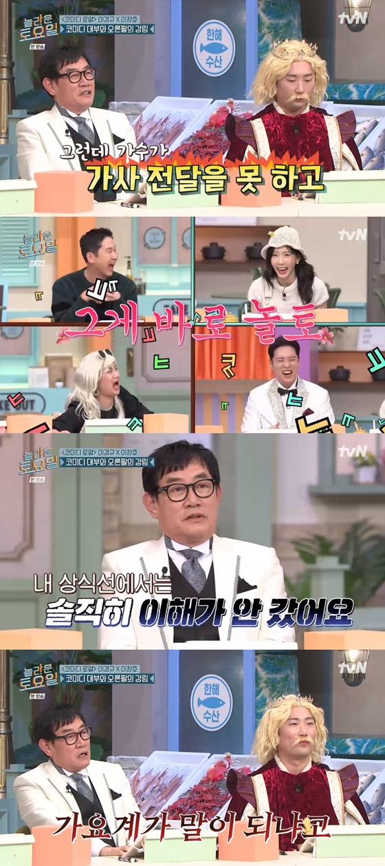 이경규는 "배우가 대사 전달이 안 되면 엄청 욕을 먹는다. 그런데 가수가 가사 전달을 못 하고, 그걸로 프로그램을 만드는 게 내 상식선에서는 솔직히 이해가 안 갔다"고 말해 웃음을 안겼다.