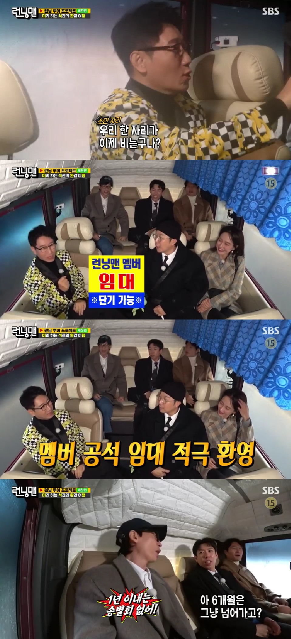 이날 럭셔리한 복장의 '런닝맨' 멤버들은 호텔로 향했고, 유재석은 "우리 이제 (버스) 한 자리가 빈다"고 언급했다. 이에 지석진은 "김종국이 (새 멤버에 대한) 좋은 아이디어를 냈다. 이 자리는 6개월 하고 나가도 된다"고 말했다.