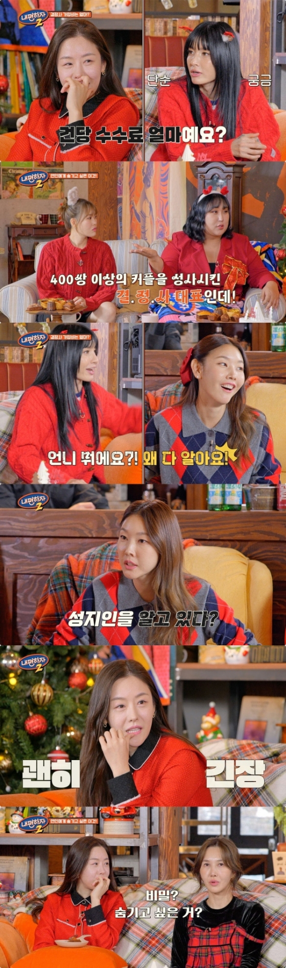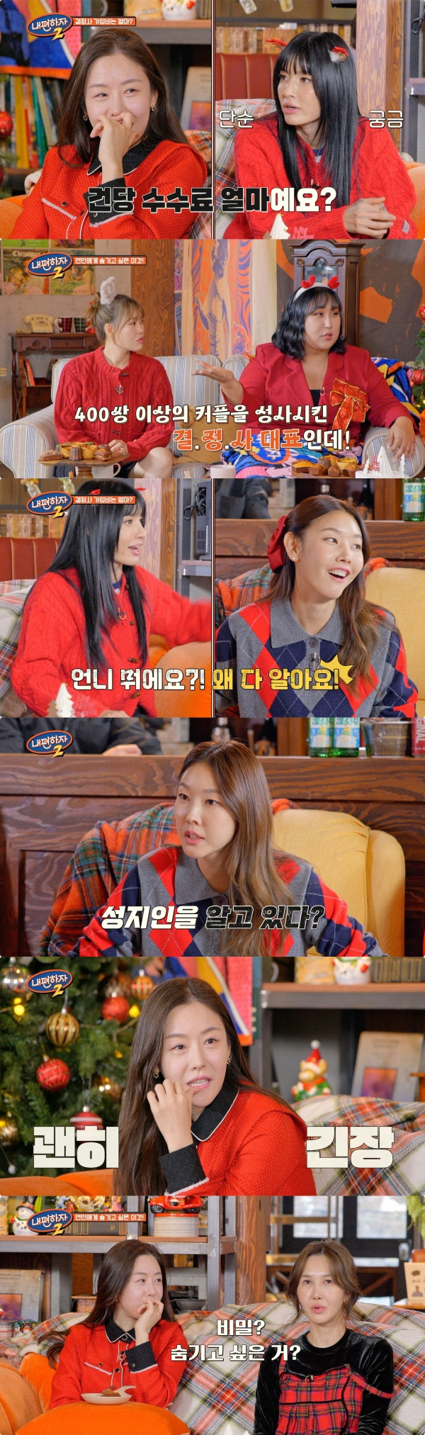 최근 녹화에 MC들(한혜진 모니카 풍자 엄지윤)은 400쌍 이상 결혼에 골인시킨 연애 전문가 성지인이 등장하자, 평소 궁금했던 것들에 대해 질문 공세를 펼쳤다. 대화 도중 한혜진은 "횟수, 기간은 상관없다"는 등 결혼정보업체 전문가다운 모습을 엿보였고, 모니카는 "언니 뭐에요? 왜 다 알아요?"라며 깜짝 놀랐다고.