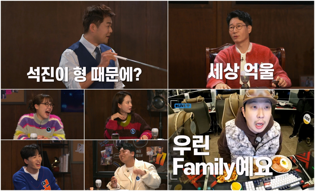 전현무는 "많은 분들이 두 분이 '런닝맨' 녹화 때만 친한 사이고 뒤에는 연락을 안 하지 않을까 생각한다"라며 지석진과 송지효의 '비즈니스 관계' 카더라 의혹을 전했다. 이에 지석진은 "사적인 통화도 많이 한다"며 일축했다. 그리고 지석진은 "전현무 씨도 나한테 그런 거 많이 물어봤다. 결혼을 해야 되냐, 말아야 되냐…"라며 자신이 많은 후배들의 '상담 잘해주는 맏형'임을 자부했다.