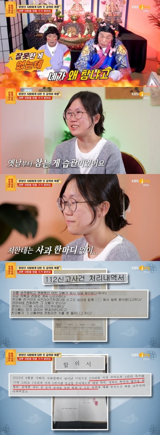 이후 의뢰인은 기숙사가 있는 공장으로 취업을 해 집을 나왔지만 폭행을 했던 남성이 공장으로 찾아온다는 말에 신고를 했다고 전했다. 이어 그는 어쩔 수 없이 천만 원을 받고 가해자와 합의를 마친 상태라고 덧붙였다.