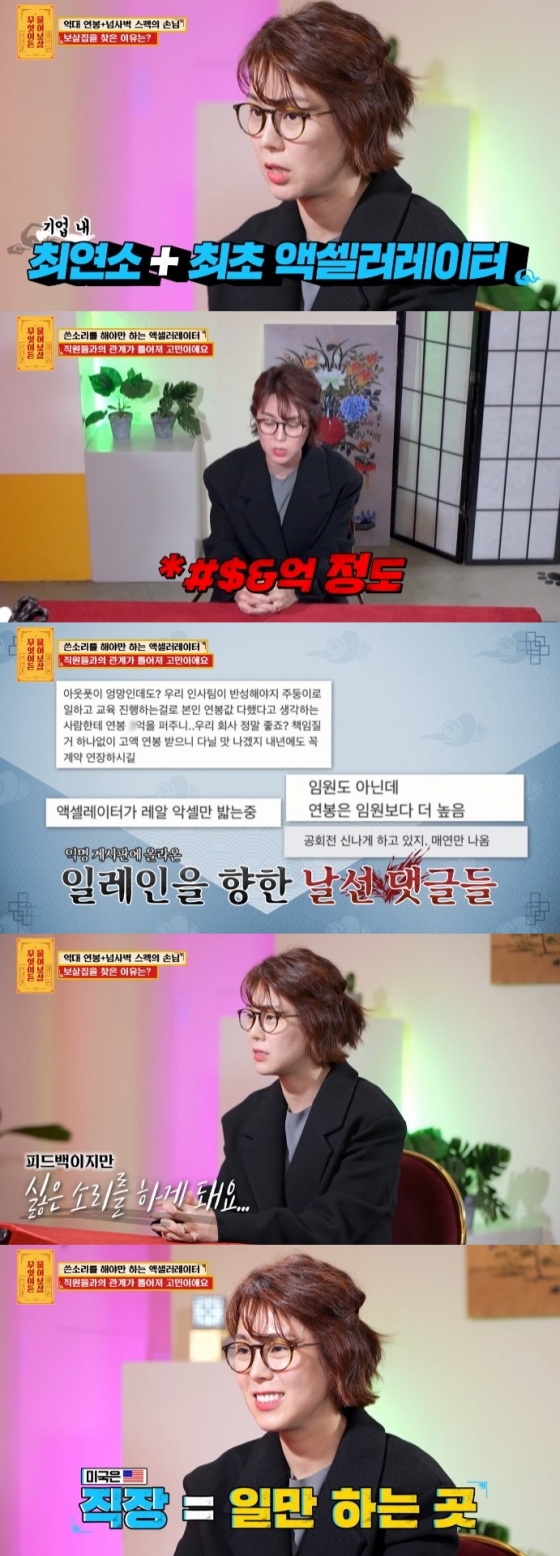 이날 방송에서 한 대기업 엑셀러레이터로 근무 중이라고 밝힌 의뢰인은 "최연소이자 최초 엑셀러레이터이다 보니 저보다 나이와 경력이 많은 분들에게 싫은 소리를 많이 해야하는 입장이다. 회사에서 싫은 소리를 하고 온 날은 마음이 많이 아프다"고 고민을 털어놓았다.