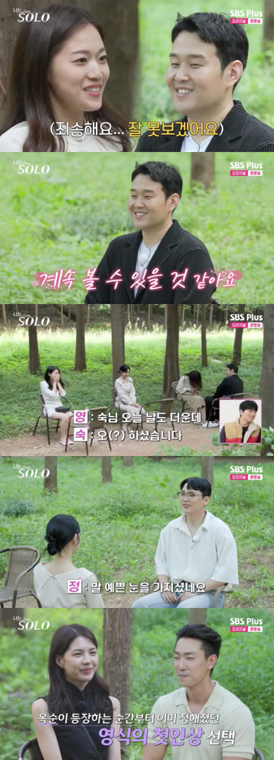 영호 역시 마중 나갔던 정숙을 선택했다. 영호는 "'정'말 예쁜 눈을 가지셨다. '숙'스럽지만 즐거웠다"며 담백한 이행시를 선보였다. 영식은 용기내어 마중 상대가 아닌 옥순을 선택했다. 영식은 "옥순답게 예쁘시기도 하고 눈이 마주친 것도 같다"며 미소지었다.