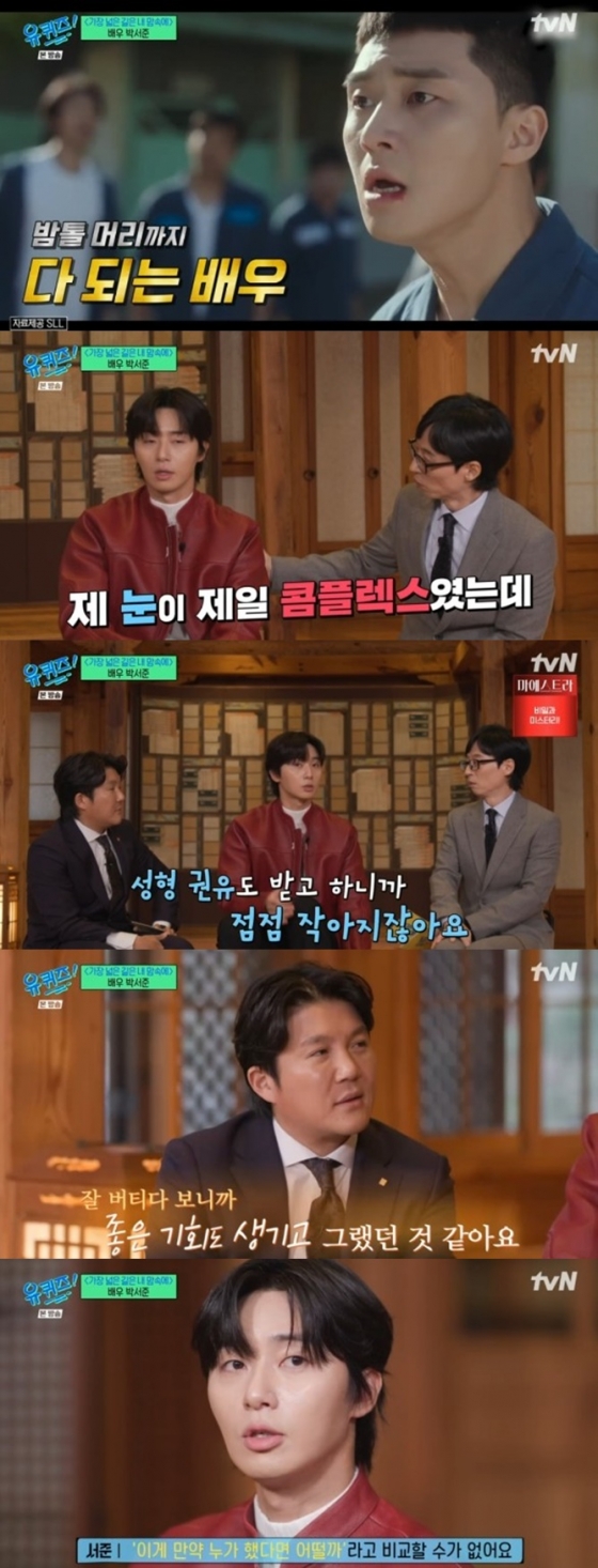 이날 방송에서 박서준은 '데뷔하자마자 스타가 된 것 같다'는 유재석의 말에 "아니다. 오디션도 많이 보고 낙방도 많이 했다. 전 사실 제 눈이 제일 콤플렉스였다. 처음에 데뷔하기도 힘들 때 지적을 많이 받았다"고 밝혔다.