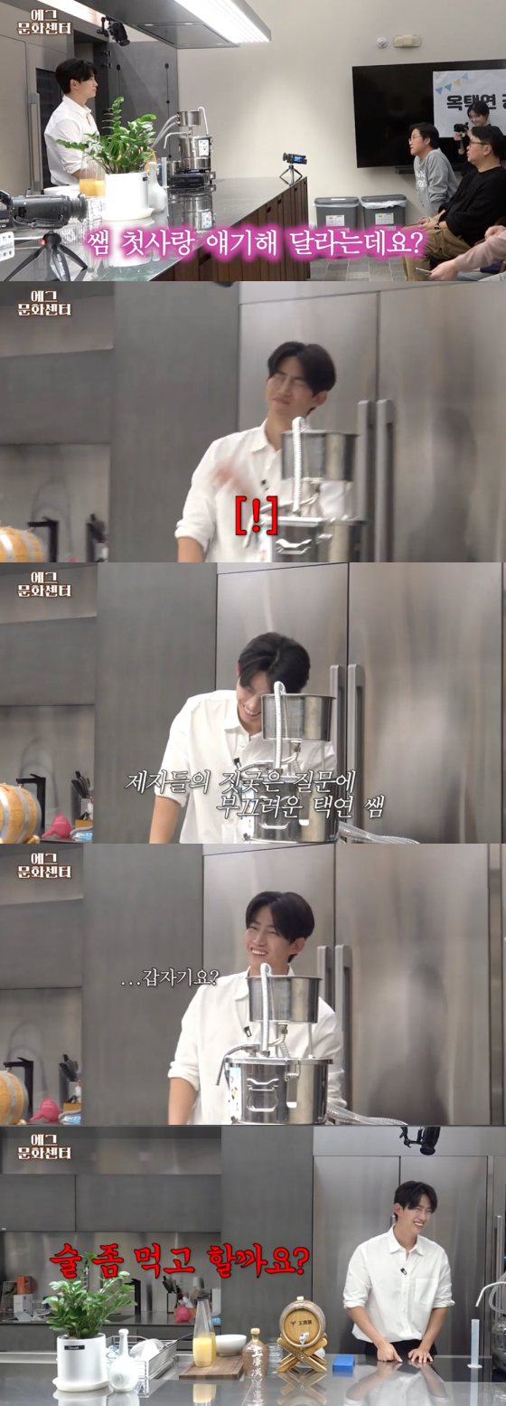 질문이 마무리되던 때, 나영석 PD는 뒷자리서 누군가 속삭이는 걸 듣곤 "쌤 첫사랑 얘기해달라는데"라 말해 폭소를 유발했다. 옥택연은 바로 당황하며 "갑자기요? 쌩뚱맞은데 술 좀 먹고 할까요"라 답해 현장을 웃음바다로 만들었다.