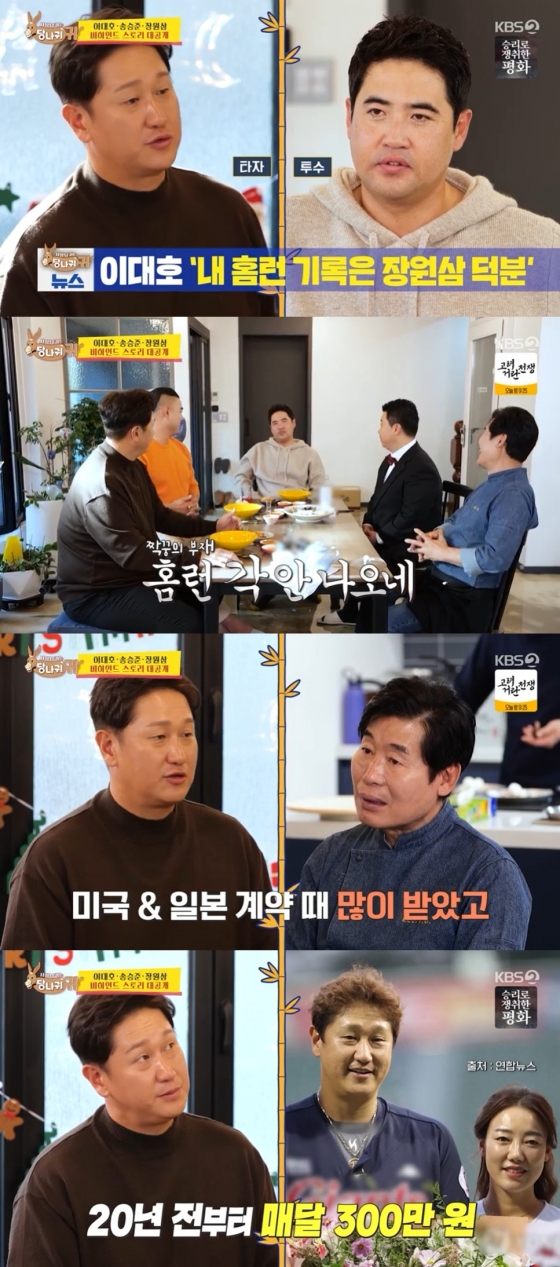 이에 이연복은 재테크 비법을 물었고, 이대호는 "재테크는 아내가 했고, 저는 20년 전부터 매달 300만 원씩 받았다. 이마저도 후배들 밥값을 다 썼다. 용돈이 모자르면 아내한테 얘기한다"고 덧붙였다.