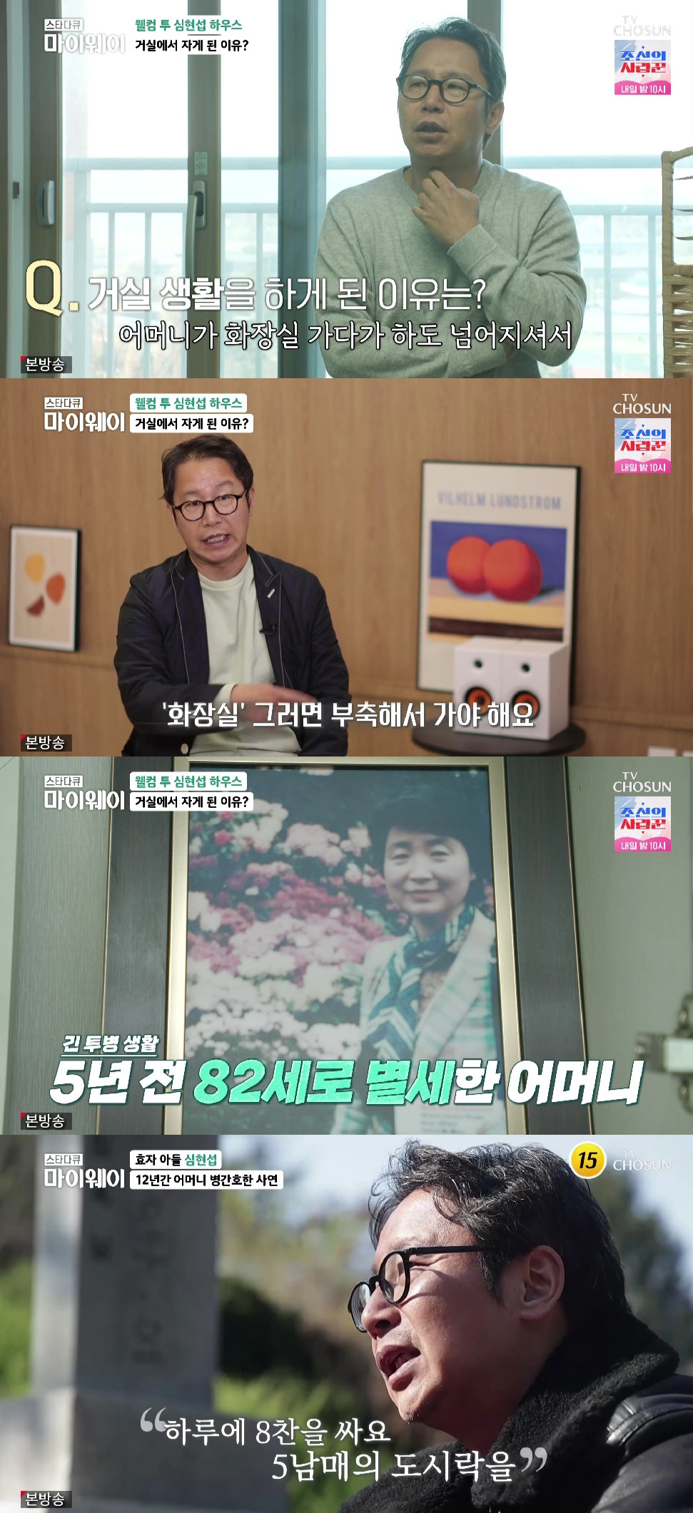 53세의 싱글로 살고 있는 거실 생활을 하는 이유에 대해서는 "안방에서 주무시는 어머니가 화장실 가다가 하도 넘어지셔서 빨리 인기척을 느끼기 위해서 거실에서 자기 시작했다. 그 이후 십수년간 이어진 습관이 된 것"이라며 "약 12년간의 투병 생활 이후 뇌경색으로 돌아가셨다"고 말했다.