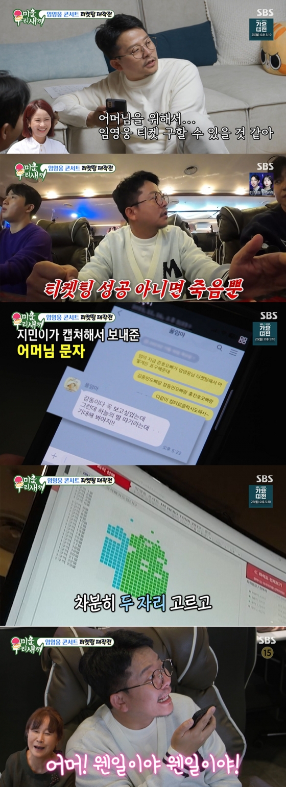 17일 방송된 SBS 주말 예능 프로그램 '미운 우리 새끼'에서는 코미디언 김준호가 여자친구 김지민의 모친을 위해 가수 임영웅의 콘서트 티켓팅에 도전하는 장면이 그려졌다.