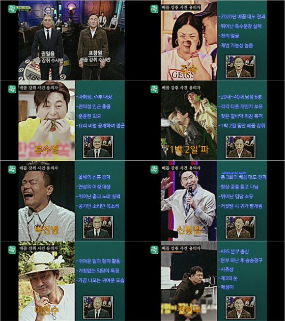 이들이 수배를 내린 첫 번째 후보는 김숙. 표창원은 김숙의 예능 패턴을 분석하며 "각종 분장을 활용해 남녀노소, 시대초월, 국적불문 부캐로 변신해가며 시청자들의 배꼽을 공격하고 있다"라고 주의를 줘 웃음을 자아낸다. '홍김동전', '사장님 귀는 당나귀 귀'를 진행하며 전천후 활약을 펼치고 있는 김숙이 2020년 KBS 연예대상에 이어 여성 최초 대상 2관왕 타이틀을 거머쥘 수 있을지 주목된다.