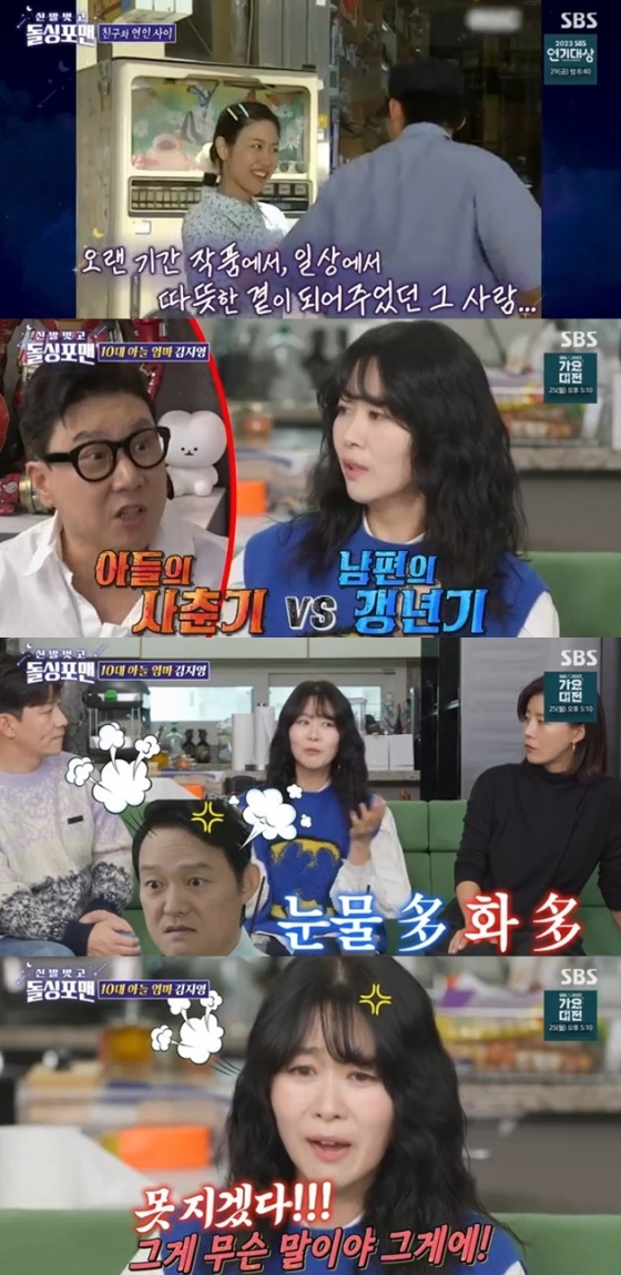 이날 이상민은 김지영에 "중3 아들을 키우지 않냐. 중3이면 사춘기 때문에 반항심이 있지 않냐"며 질문을 건넸다. 이에 김지영은 "아들 때문에 힘든 적은 없다. 아들의 사춘기와 남편의 갱년기 사이에 껴있다는 게 힘들다"고 토로했다. 이어 그는 "남편이 갱년기라 눈물도 많고 화도 버럭 낸다"고 설명했다.