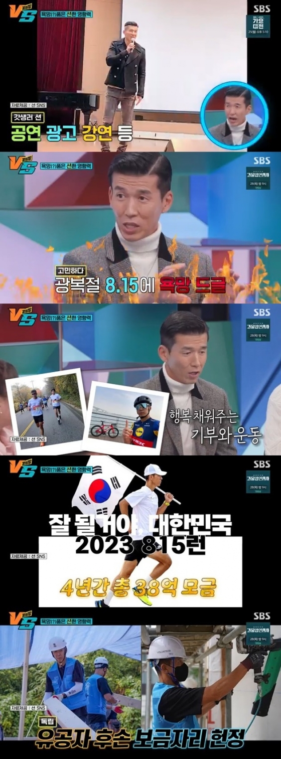 션은 '뛸 때 밥도 안 먹고 화장실도 안 가냐'는 질문에 "밥도 안 먹고 화장실도 안 갔다. 파워젤 먹으며 뛰었다. 그렇게 기업 후원을 받고 38억 모금이 돼서 독립 유공자 후손 분들 집을 지어드리고 있다"고 답했다.