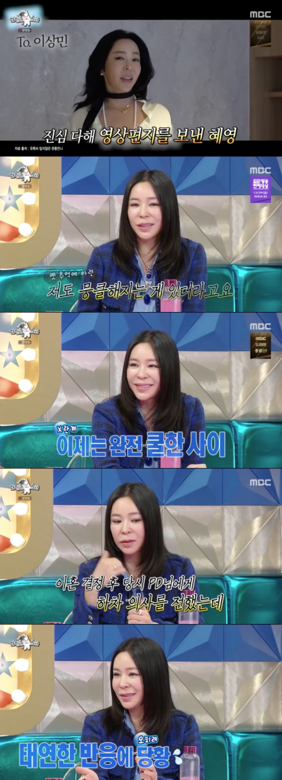 이혜영은 앞서 이지혜의 유튜브 채널에서 전 남편인 이상민에게 영상편지를 보내 화제를 모았다. 이혜영은 이날 "그날 샵 얘기가 자꾸 나오니까 저도 뭉클해지는 게 있더라. 그래서 얘기하게 됐던 것 같다"며 자발적인 영상편지였다 밝혀 탄성을 자아냈다.