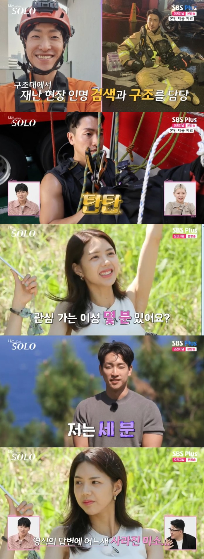 영식은 "현재 서울에서 7년 차 소방관이다. 재난 현장 인명 검색과 구조를 담당하고 있다"고 밝혀 감탄을 자아냈다. 그러면서 "제 직업 되게 좋아하고 만족한다. 3조 1교대라 24시간 근무하고 이틀을 쉰다. 평일 데이트도 가능하다"고 어필했다. 또 "취미는 요리다. 집에서 같이 요리해서 먹는 거 좋아한다"고 덧붙였다.