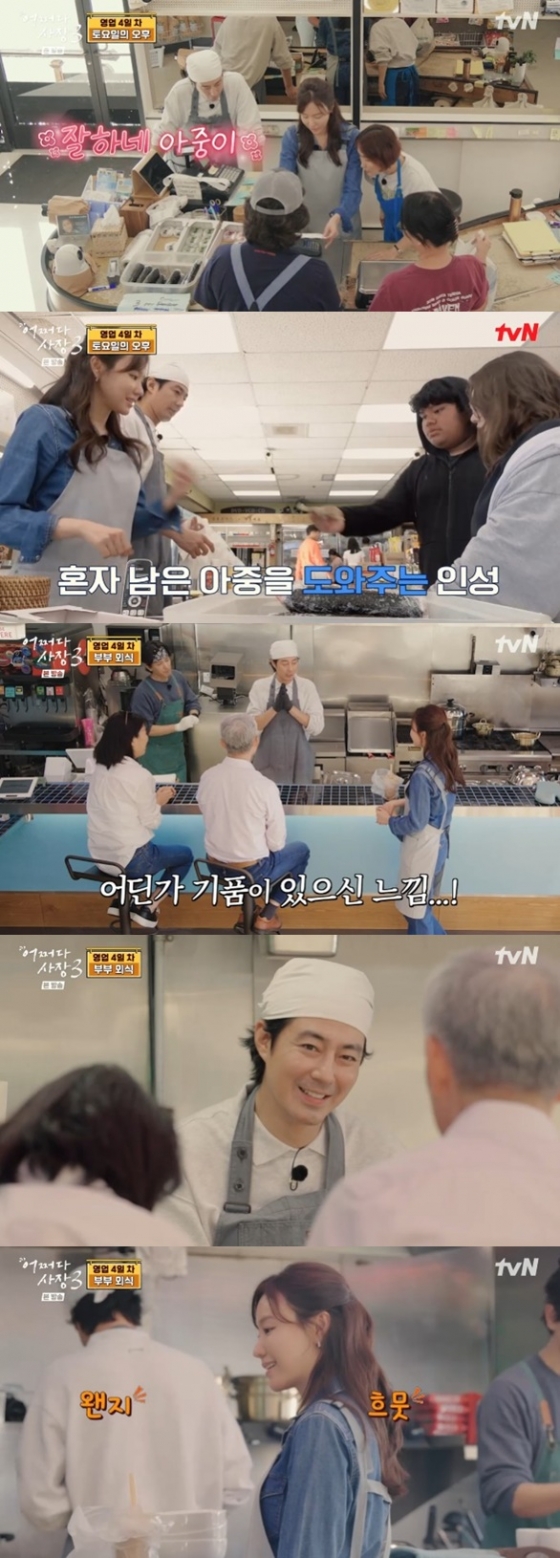 21일 방송된 tvN 예능 프로그램 '어쩌다 사장3' 9화에서는 미국 한인 마트 '아세아 마켓' 영업을 이어가는 '사장즈' 차태현, 조인성, '알바즈' 박경림, 김아중, 임주환의 모습이 공개됐다.