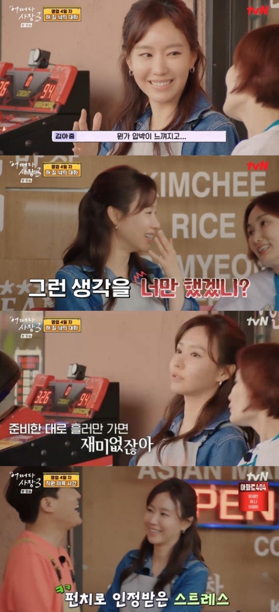이날 방송에서 박경림은 김아중을 불러내 가게 밖을 나와 잠시 휴식 시간을 가졌다. 김아중은 '오늘 해 보니까 어떠냐'는 질문에 "저는 정말 내일 선배님이랑 같이 가는 게 나을 것 같아요. 다 날 속였어"라고 답했다. 이에 박경림은 "그런 생각을 너만 했겠냐. 소용없는 현실 부정이다"라고 돌직구를 날려 웃음을 자아냈다.