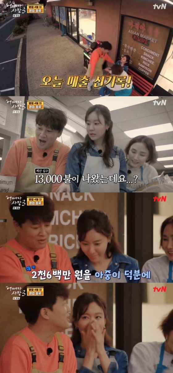 21일 방송된 tvN 예능 프로그램 '어쩌다 사장3' 9화에서는 미국 한인 마트 '아세아 마켓' 영업을 이어가는 '사장즈' 차태현, 조인성, '알바즈' 박경림, 김아중, 임주환의 모습이 공개됐다.