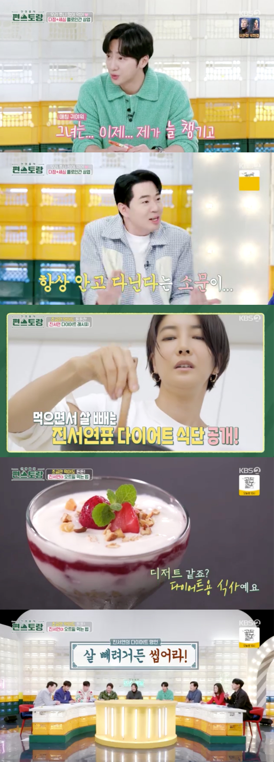 진서연은 "다이어트의 포인트는 나를 열받게 하면 안 된다. 욱해서 먹게 되니까. 열받지 않게 달래줘야 한다. 다이어트할 때 안 씹으면 열 받는다. 배가 고플 틈을 주면 안 된다. 먹으면 포만감이 유지되니까"라는 다이어트 철학도 함께 공개해 탄성을 안겼다.