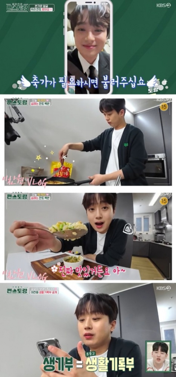 레전드 레시피를 갱신한 이찬원은 요즘 유행 중인 학창 시절 생활기록부 열람에 동참하며 시선을 모았다. 이찬원은 6년 개근상 표창부터 교육감상까지 엄청난 수상 경력을 소개했다. 이어 "고등학교 1학년 떄 가수의 꿈을 접으려고 했던 때가 있었다. 그때는 고등학교 교사가 되고 싶었다. 근데 고등학교 2학년 때 다시 가수로 돌아왔다"고 밝혔다.