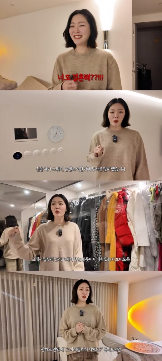 그는 옷장을 소개하며 "바닥에 옷이 있는 이유를 모르겠다. 옷장에는 먼지가 쌓일 수밖에 없기 때문에 문을 닫아놨다. 근데 문으로 막혀있으면 답답해서 유리로 했다. 장롱을 이렇게 짜놓으니까 확실히 진짜 옷을 더 안 사게 된다. 바닥도 까만 카펫을 깔아놨다. 먼지가 쌓이면 티가 나서 좋다. 청소를 바로바로 할 수 있다"고 설명했다.