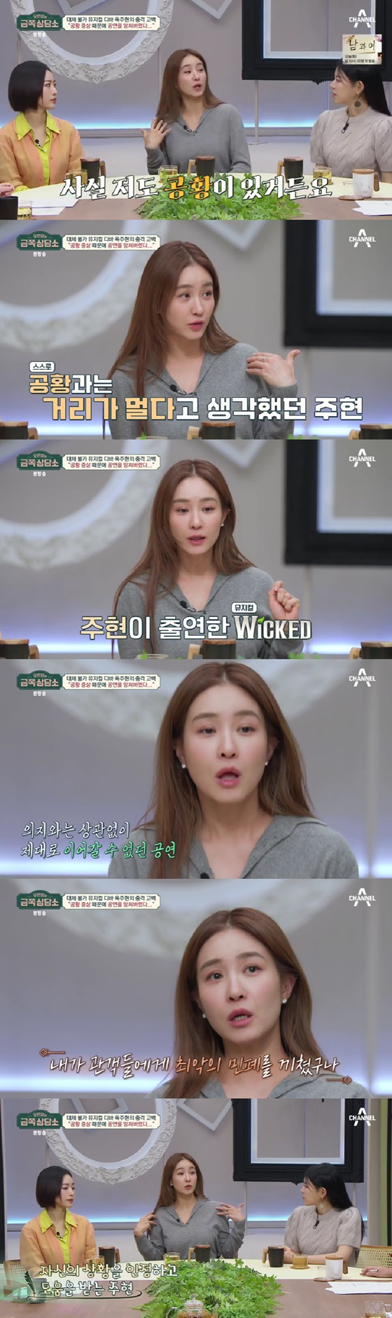 이날 옥주현은 "사실 저도 공황장애가 있다"며 "'대체 어떤 사람에게 공황이 생기는 걸까 싶을 정도로 저는 공황장애를 안 겪을 줄 알았다"고 말문을 열었다.
