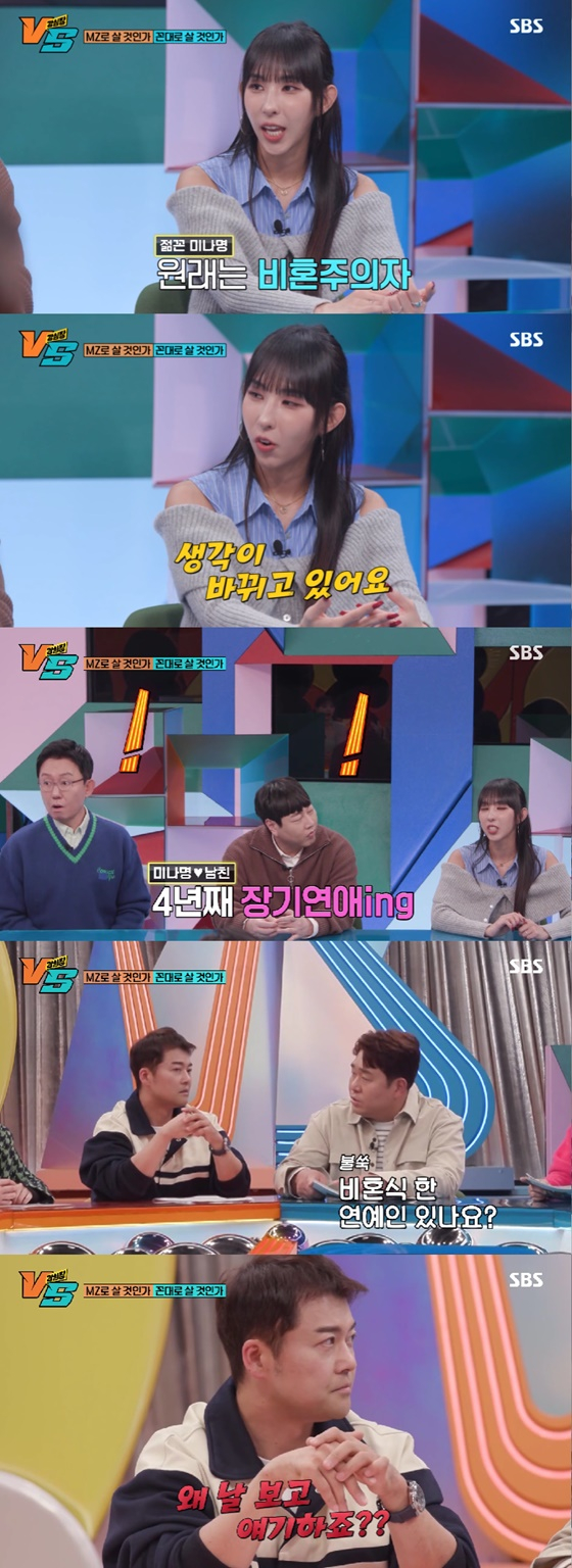 이날 게스트로 출연한 댄서 미나명은 4년째 열애 중인 남자친구가 있다고 밝혔다. 그는 남자친구를 언급하며 "제가 비혼주의였다. 그런데 좋은 사람을 만나니 '이 사람이라면 결혼해 봐도 좋겠다' 하는 생각이 들더라"고 말했다.