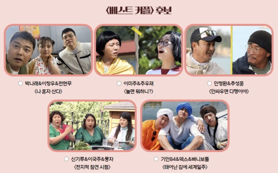 먼저 지난 '2022 MBC 방송연예대상' 베스트 커플상을 수상했던 '나 혼자 산다'의 팜유라인, 박나래, 이장우, 전현무가 올해 또 한 번 수상의 영광을 품에 안을지 시선이 집중된다. 침샘을 자극하는 팜유 세미나부터 건강검진 편까지 나왔다 하면 광대를 치솟게 만드는 검증된 예능 케미스트리를 뽐내고 있다.
