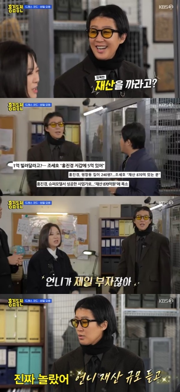 이날 방송에서 조세호는 "이쯤에서 살짝 사과의 말씀을 드리고 싶다. 우리끼리 예능적으로 좀 재밌게 하기 위해서 홍진경 누나의 재산 불리기를 하다가 너무 기사화됐다"며 홍진경에게 사과했다. 이에 김숙이 "그러니까 정확한 금액을 얘기해라. 네가 얼마 있는지"라고 이야기하자, 홍진경은 "정확한 재산을 까라는 말이냐"며 어이없어했다.