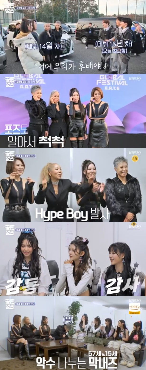 골든 걸스 멤버들은 대기실에 뉴진스가 들어오자 "애기들 왔다. 너무 예쁘다. 인형이다"라며 눈을 떼지 못했다. 이어 골든 걸스는 뉴진스의 'Hype Boy'를 부르며 반갑게 인사를 나눴다.