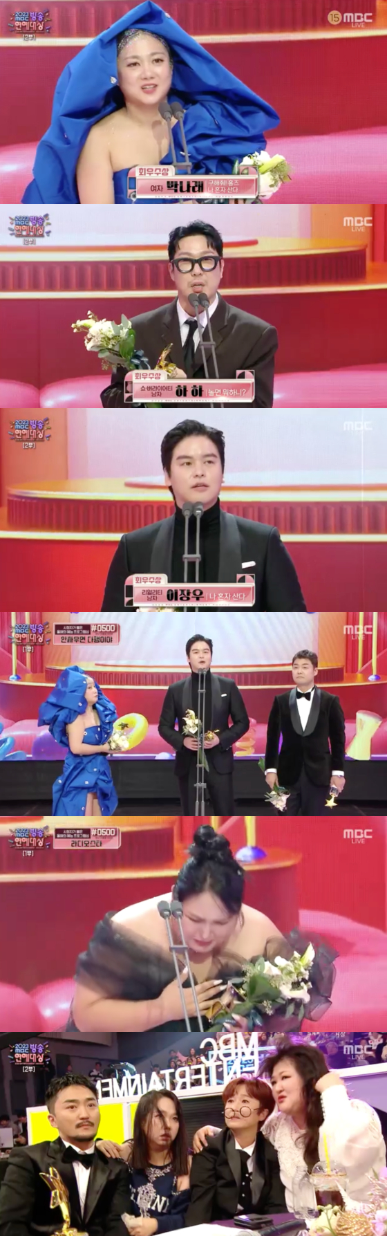 최우수상은 박나래, 하하, 이장우가 수상했다. 박나래는 돌아가신 할아버지를 언급하며 울컥했고, 하하는 가족들과 제작진 정준하, 신봉선에게 감사를 전했다. 이장우는 여자친구에게 "결혼 미뤄야 할 것 같다"며 '나 혼자 산다'에 대한 애정을 드러냈다. 우수상은 주우재와 장도연이 수상했다.