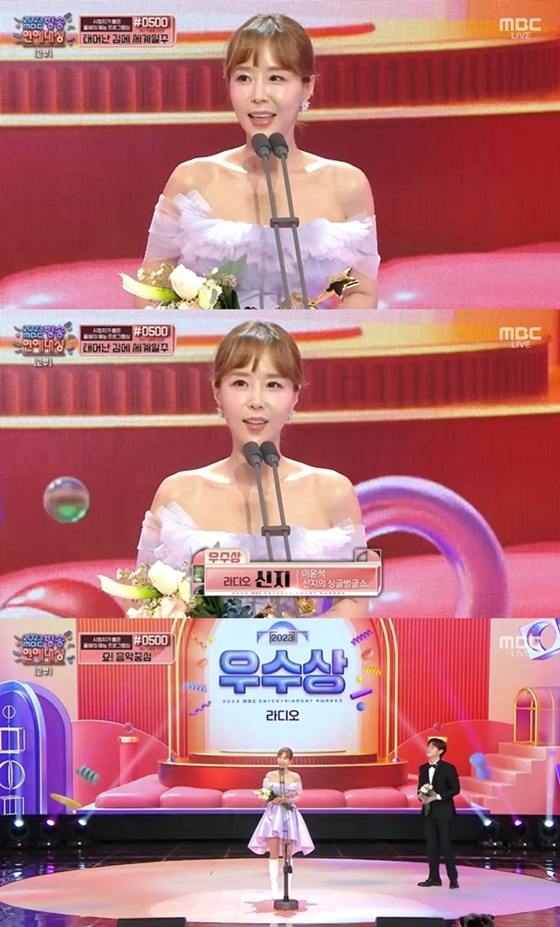 지난 29일 오후 8시 30분 MBC '2023 MBC 방송연예대상'이 진행된 가운데, MBC 표준FM '이윤석, 신지의 싱글벙글쇼'(이하 '싱벙')로 활약 중인 신지가 라디오부문에서 우수상을 수상했다.