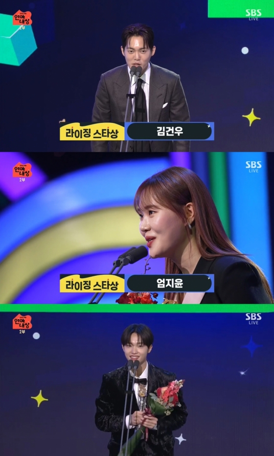 라이징스타 상은 배우 김건우, 코미디언 엄지윤, 가수 손동표가 이름을 올렸다. 먼저 김건우는 "별다른 활약을 한 게 없어서 상을 받은 게 얼떨떨하다. 활동 시작하고 처음 받는 상이라 이 상은 오랜 시간 기억에 남을 것 같다"라며 "'미운우리새끼' 촬영하면 선배님들 보고 웃고 즐거워하다 촬영이 끝난다. 갑자기 찾아온 막내를 따뜻하게 맞이해 주셔서 감사하다. 올 한해가 얼마 남지 않았다. 올해 고생 많았고 내년엔 기분 좋은 일이 많았으면 좋겠다"라고 말했다.