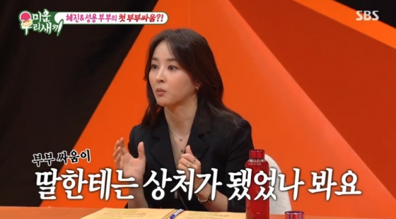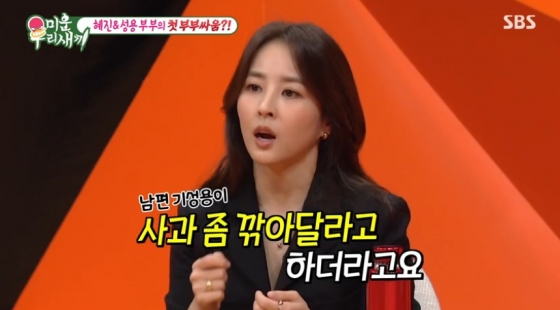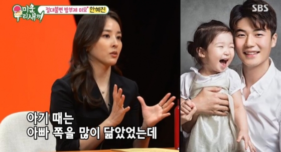 한혜진은 "그때 한번 짧게 싸웠는데 그걸 딸이 기억하더라. 나름 딸한테 상처가 됐나 보다. 한국에 돌아와서 시부모님을 만났는데 딸이 갑자기 밥 먹다가 '엄마 아빠는 맨날 싸웠어. 엄마는 울었어'라고 얘기를 하는 거다"며 "시부모님이 놀라셨다. 그 다음부터는 딸 앞에서는 안 싸우려고 노력하고 조심한다"고 고백했다.
