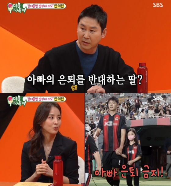 "아빠의 은퇴를 적극적으로 반대한다고"라고 묻는 MC 신동엽에게 한혜진은 "또래 반 친구들이 한창 축구에 관심을 가질 나이니까, (딸이) 학교에서 '우리 아빠 축구선수야 얘기하니까' 친구들이 엄마들한테 가서 '축구선수 중에 기씨가 있냐'고 물어봤다더라. 친구들이 '오' 하면서 알아주니까, 아빠가 유명한 게 좋다고 은퇴하면 안 된다고 적극 말리고 있다"고 전했다.