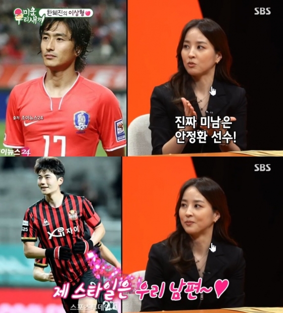 한혜진은 기성용에 대한 애정도 숨기지 않았다. 서장훈이 "축구선수 중 미남이 많다. 역대 미남 축구선수 중에서 우리 남편이 1등인가'라고 묻자, 한혜진은 "진짜 미남은 안정환 선수다"면서도 "내 스타일은 우리 신랑"이라며 기성용에 대한 애정을 나타냈다.