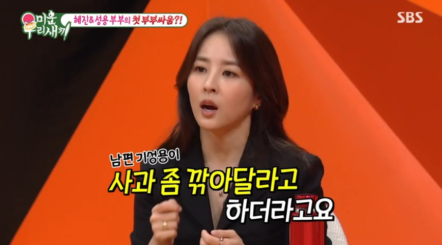 이날 방송에서 한혜진은 "나이 차가 있다 보니까 진짜 잘 안 싸우는데, 영국 생활이 좀 지친다. 날씨도 그렇고 아이도 같이 키우니까 지칠 때가 많았다"고 운을 뗐다. 한혜진은 이어 "(남편이) '사과를 깎아 달라'고 하더라. 사과 정도는 본인이 깎아 먹을 수 있는데 깎아 달라고 하니까 (내가) '본인이 깎을 수 있잖아'라고 얘기했는데 (남편은) 그게 섭섭했나 보다"며 "분위기가 조금 안 좋아졌다. 영국에서 힘들었던 그런 시간들이 복받쳐 올라오면서 눈물이 나더라"고 말했다.