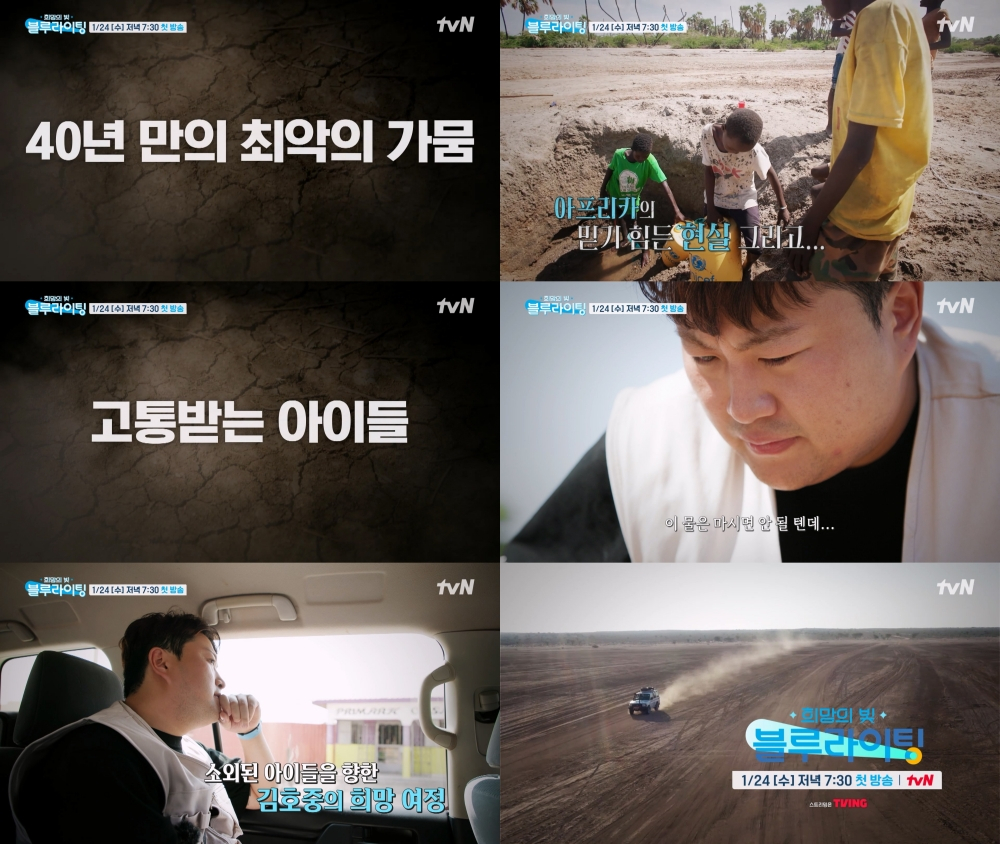 3일 CJ ENM에 따르면 오는 24일 방송하는 tvN '희망의 빛, 블루라이팅' 1회에서는 가수 김호중이 40년 만에 최악의 가뭄이 들이닥친 케냐 투르카나 사막지대로 향한다.