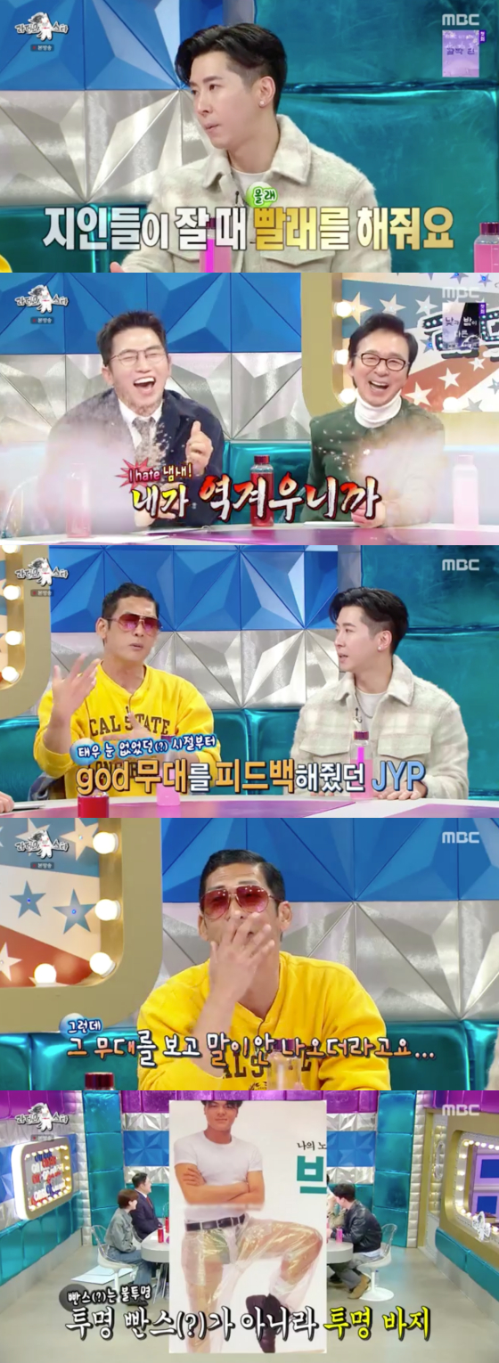 박준형은 또 화제가 된 박진영의 청룡영화상 무대에 대해서는 "나한테는 완벽하게 하라더니, 말이 안 나오더라"고 당황했다. 그는 이어 "의상은 (괜찮았다). 옛날에도 투명 빤스(?) 입었는데 뭐"라 말해 폭소를 유발했다.