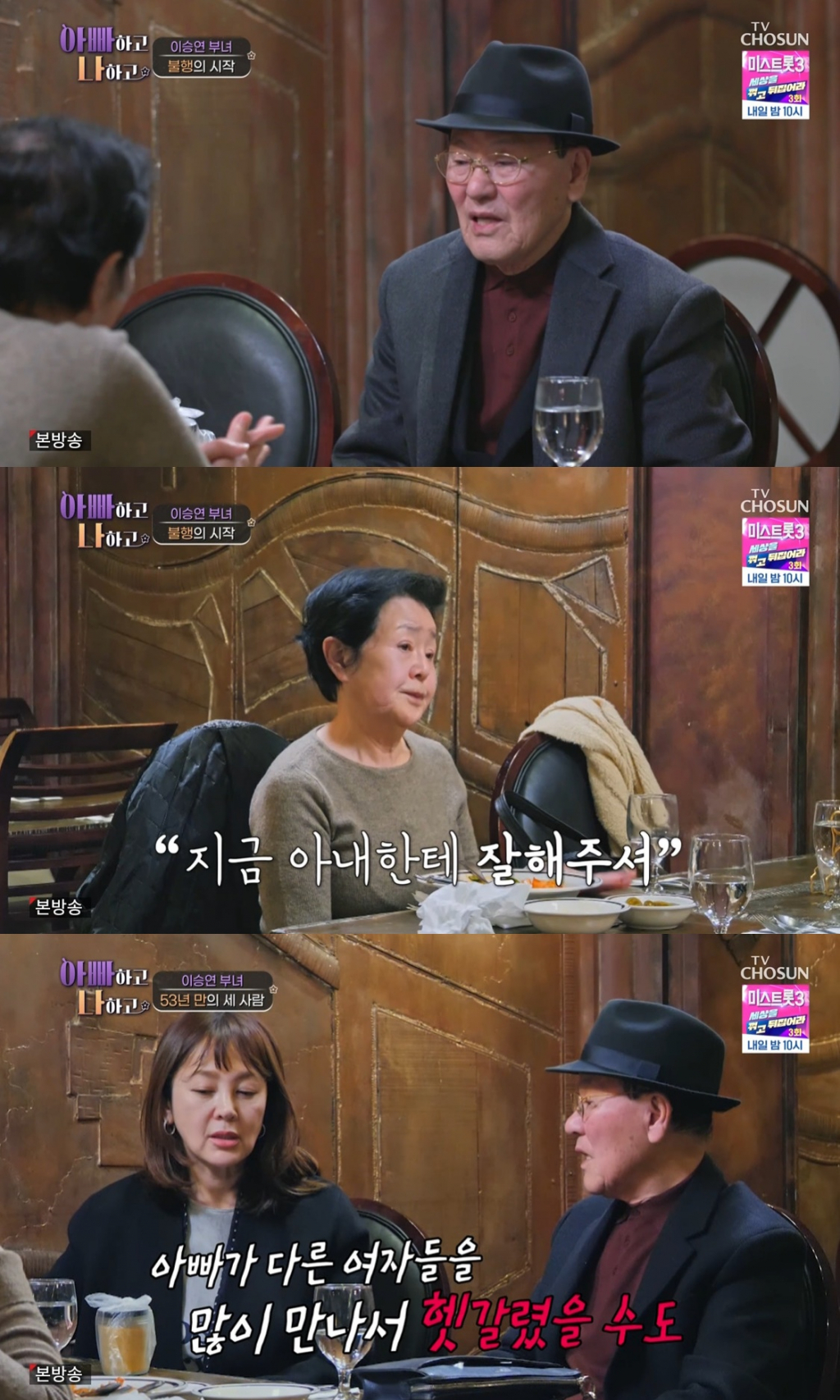 3일 오후 방송된 TV조선 '아빠하고 나하고'에서는 이승연과 친부모님의 생애 첫 삼자대면하는 모습이 그려졌다.