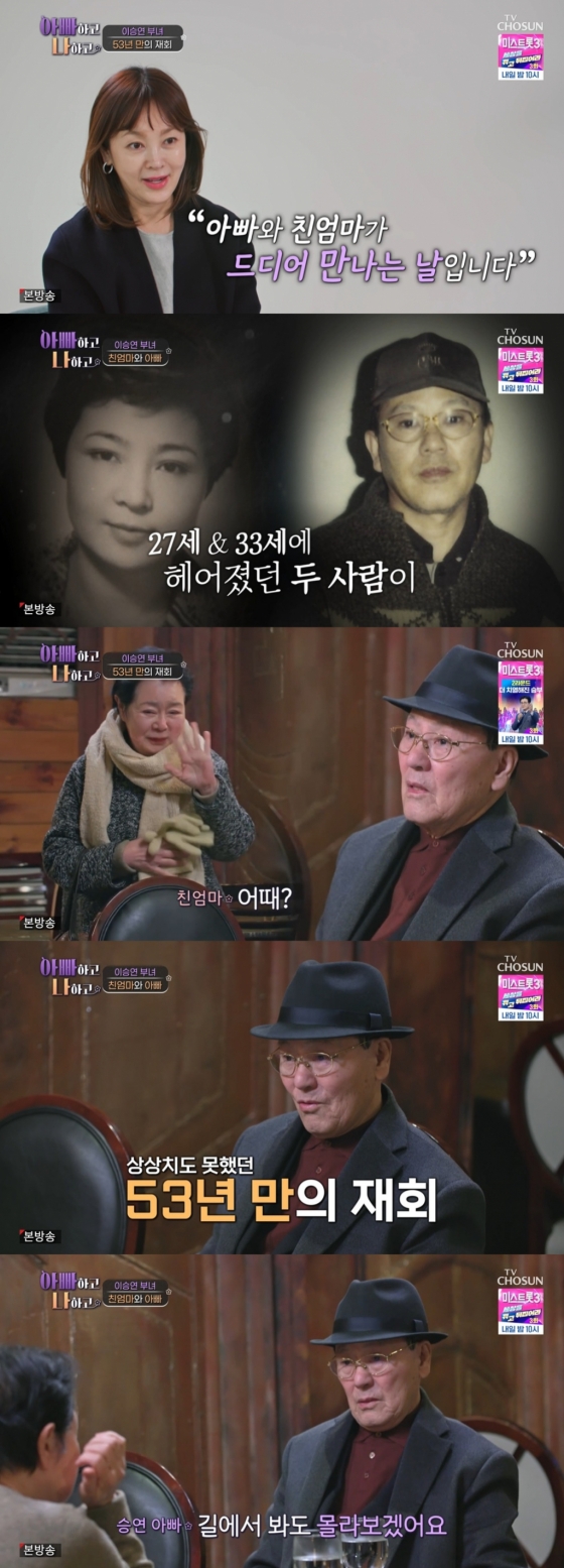 지난 3일 오후 방송된 TV조선 '아빠하고 나하고'에서는 이승연과 친부모가 53년 만에 처음으로 삼자대면하는 모습이 그려졌다.