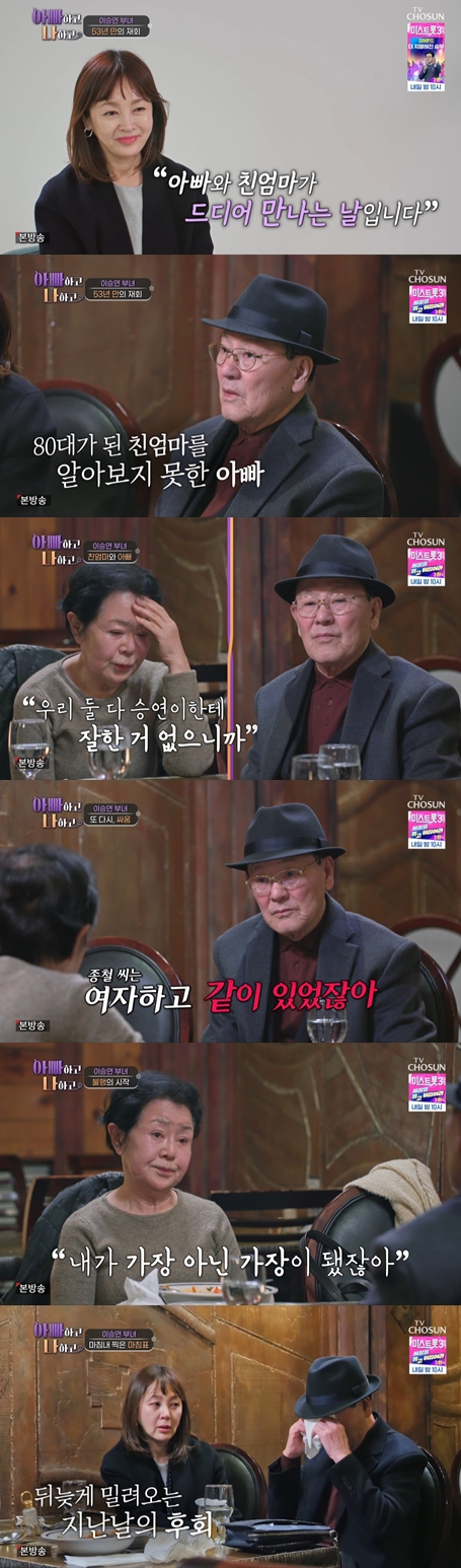 이날 이승연의 친부모님이 53년 만에 재회하며 많은 시청자들의 눈물샘을 자극했다. 만남에 앞서 이승연은 "큰일이긴 하지만 한 번은 꼭 있었으면 좋겠다 했던 일이기 때문에 담담하게 받아들이려고 애를 썼다"라며 마음가짐을 전하기도 했다. 착잡함과 긴장감에 휩싸인 사이 친엄마가 모습을 드러내자, 이승연의 아빠는 "처음 본 사람 같았다. (승연이의) 친엄마라고 보기가 힘들 정도로 생소했다"라며 53년 만에 전처를 만난 소감을 밝혔다. 그리고 80대가 되어 마주한 두 사람의 어색한 첫인사가 이어졌다. 이승연의 아빠는 "꿈인지 생시인지 모르겠다"라고 말했고, 친엄마는 "자식 덕에 이렇게 만나게 된다"라며 첫마디를 건넸다.